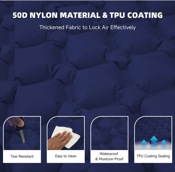 Materac wykonany jest z trwałego nylonowego materiału z domieszką TPU. Jest on nie tylko miły w dotyku, ale również odporny na wilgoć. Dzięki temu materac zapewnia bardzo dobrą izolację od zimnego podłoża, co pozwala na jego bezpośrednie położenie na ziemi lub piachu.