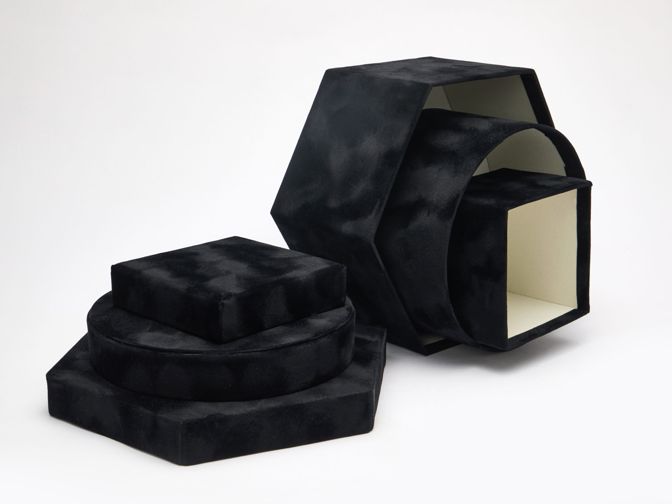 Materiał posiada bardzo oryginalną, ciekawą strukturę. Każde pudełko z taśmą/rączkami.