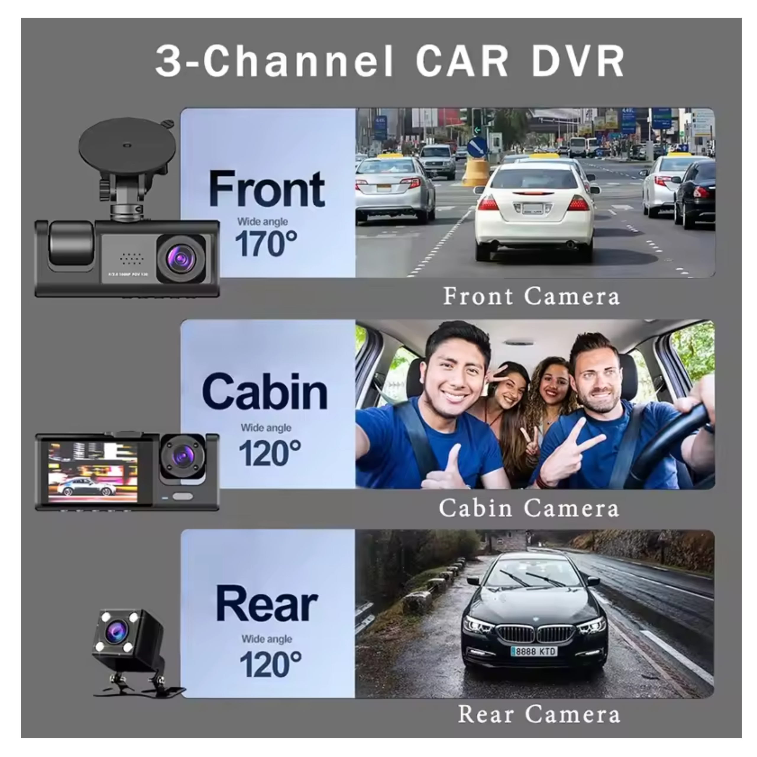 - Trzy kanały: Jednoczesne rejestrowanie z przodu, wnętrza i tyłu pojazdu zapewnia pełne pokrycie wideo.