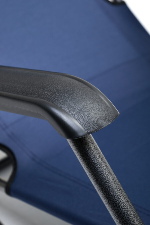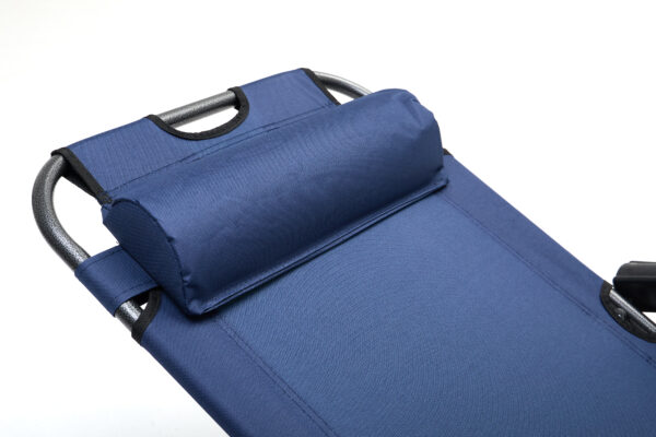 Model w kolorze dark blue wyróżnia się nowoczesnym wyglądem, stabilnym stelażem oraz komfortowym miejscem do wypoczynku. Leżak został wyposażony w wygodny zagłówek i szerokie siedzisko, co zwiększa komfort użytkowania podczas opalania, czytania lub odpoczynku.
