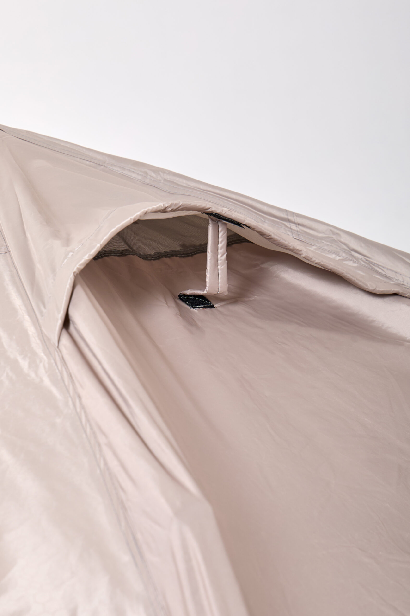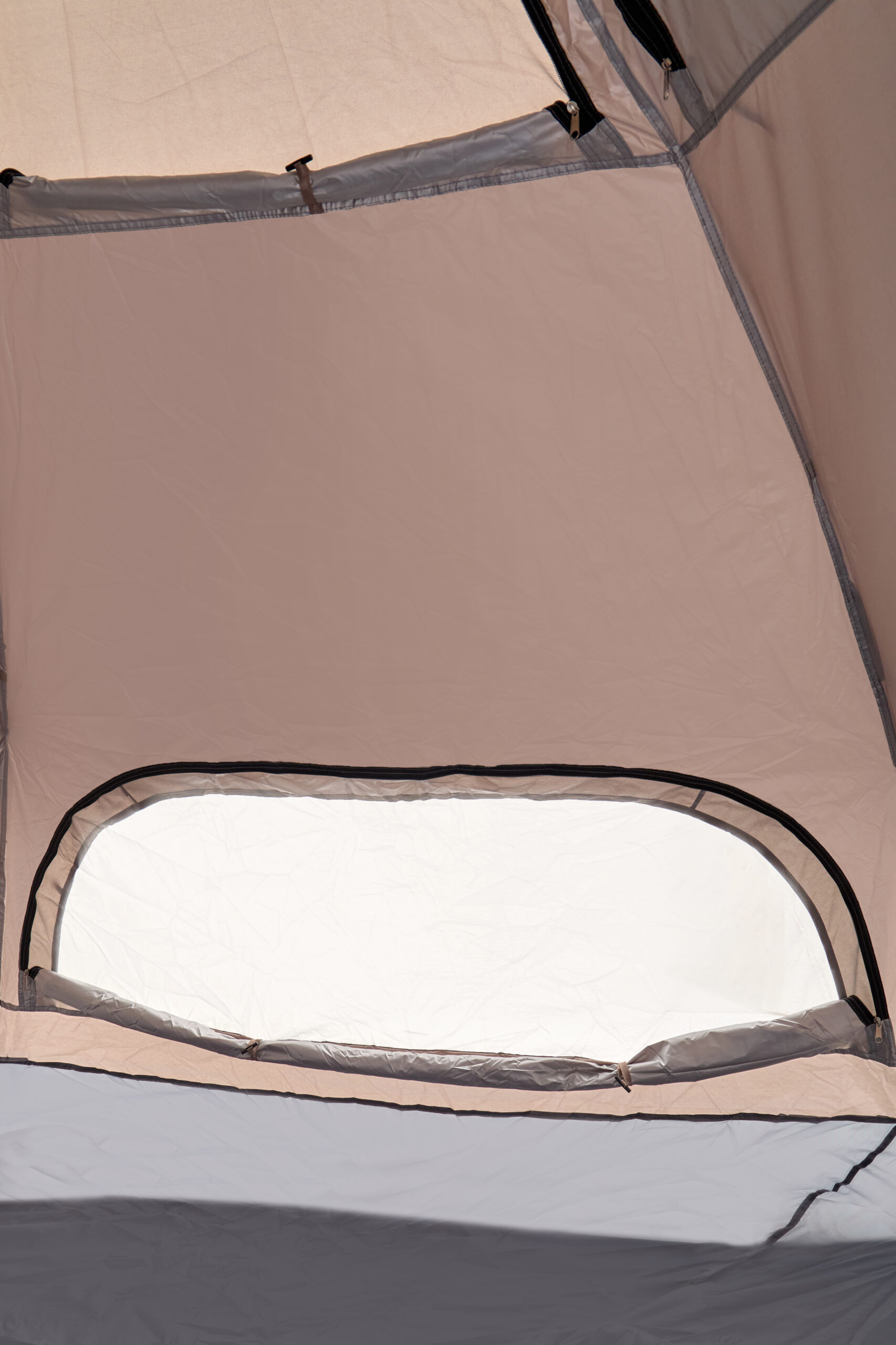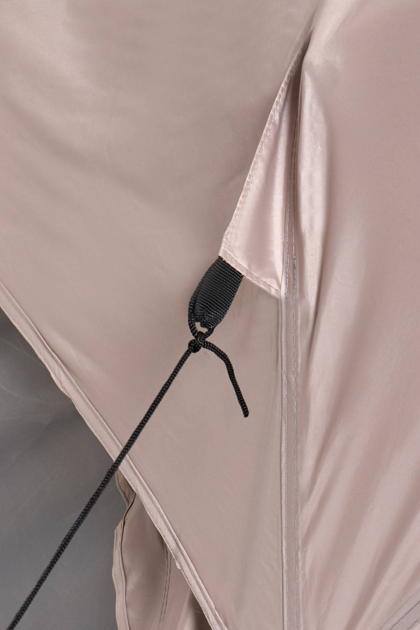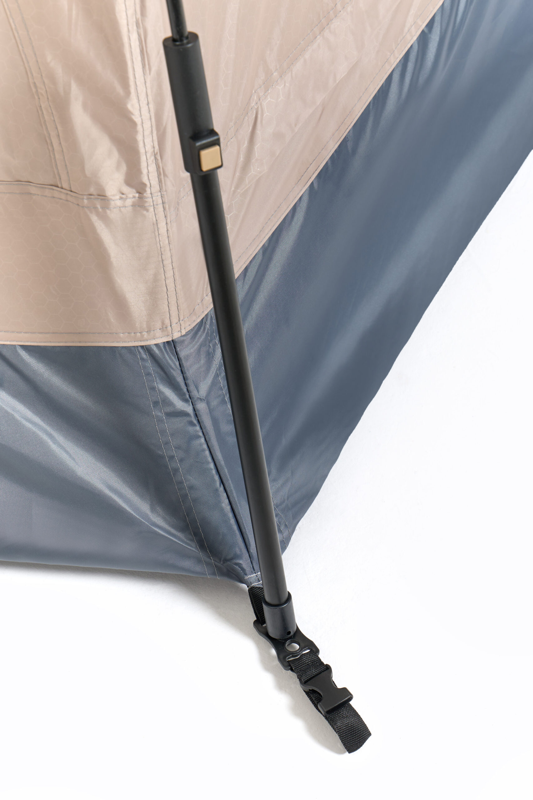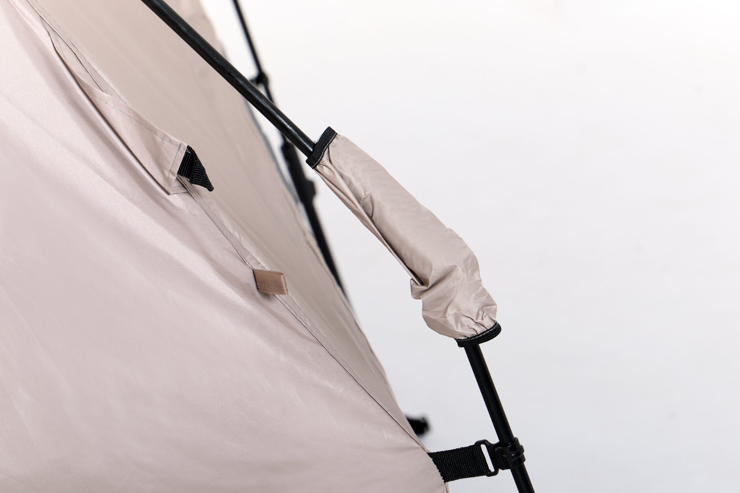 Jasna górna część namiotu w połączeniu z ciemniejszą podstawą nadaje mu nowoczesny, estetyczny wygląd. Otwierane wejście oraz panele wentylacyjne z siatki wspierają cyrkulację powietrza, co sprawdza się szczególnie w cieplejsze dni.