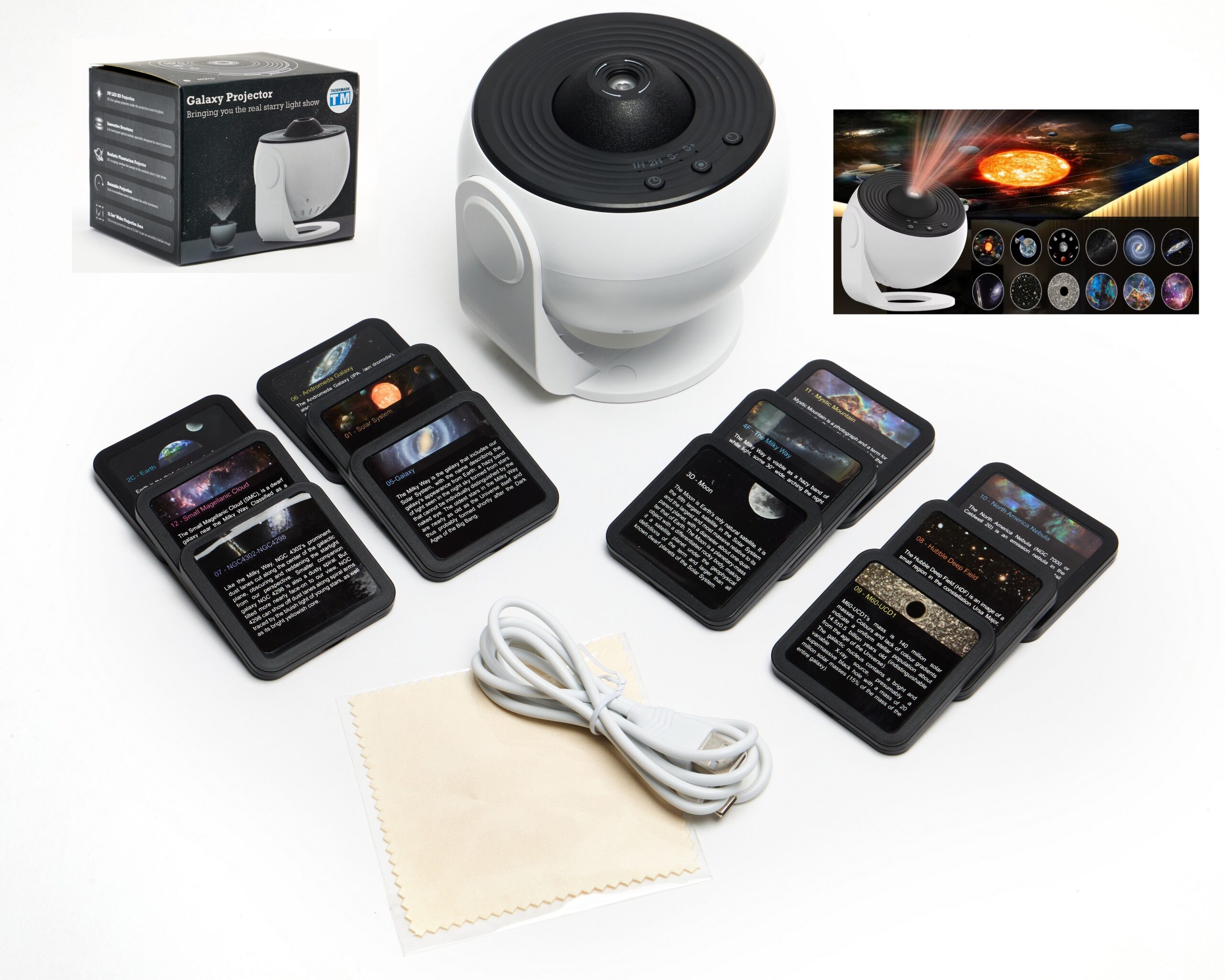 Wyraźna i realistyczna projekcja – projektor wyświetla wyraźny i realistyczny obraz w 13 unikalnych, szczegółowych wzorach galaktyk, mgławic, Księżyca, Układu Słonecznego i innych zjawisk kosmicznych