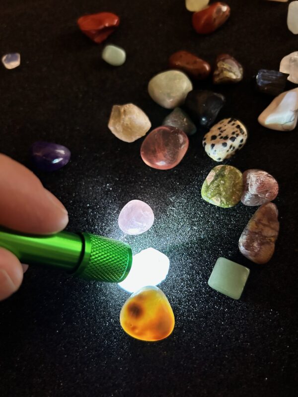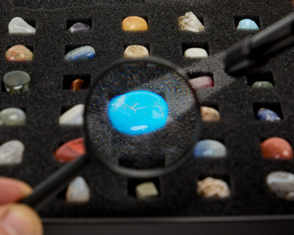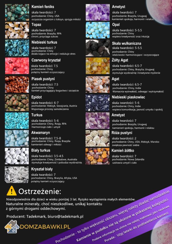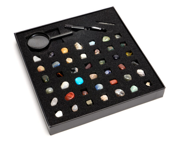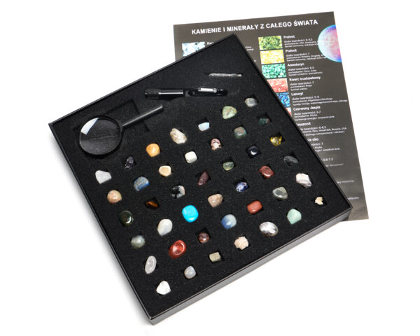Zestaw kolekcjonerski Kamienie Zbiór minerałów naturalnych zestaw 43 kamieni lupa latarka